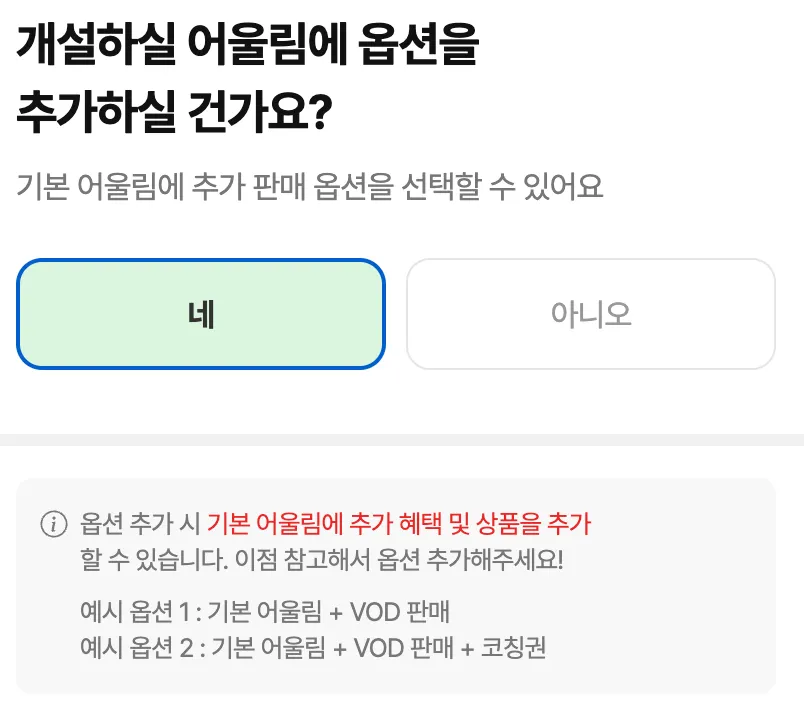 어울림에 옵션을 추가할 수 있어요. 상황에 따라 VOD, 1:1 만남, 상품 등 다양한 서비스를 옵션으로 붙여보세요.