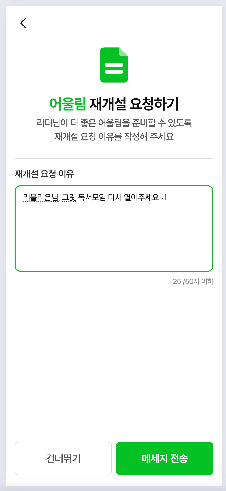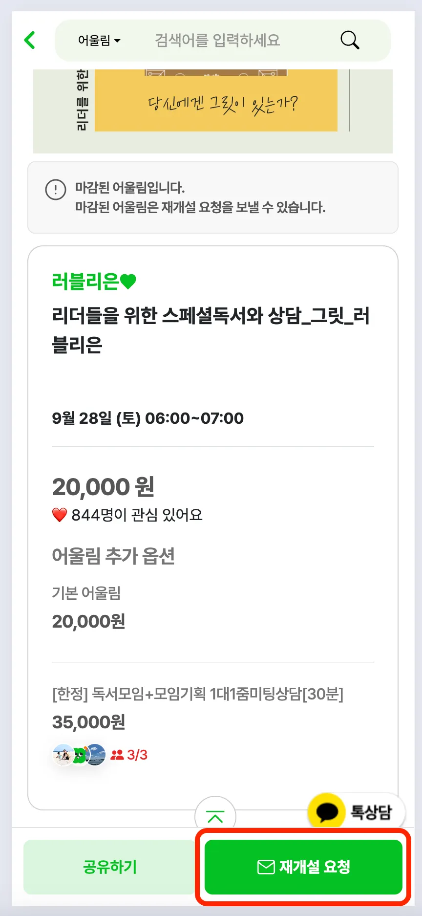 너무나 참여하고 싶은 어울림인데 일정이 지났거나, 일정이 맞지 않아 참여가 안되는 어울림 있으셨나요? 이제 리더님께 재개설 요청으로 참여의사를 보내보세요.