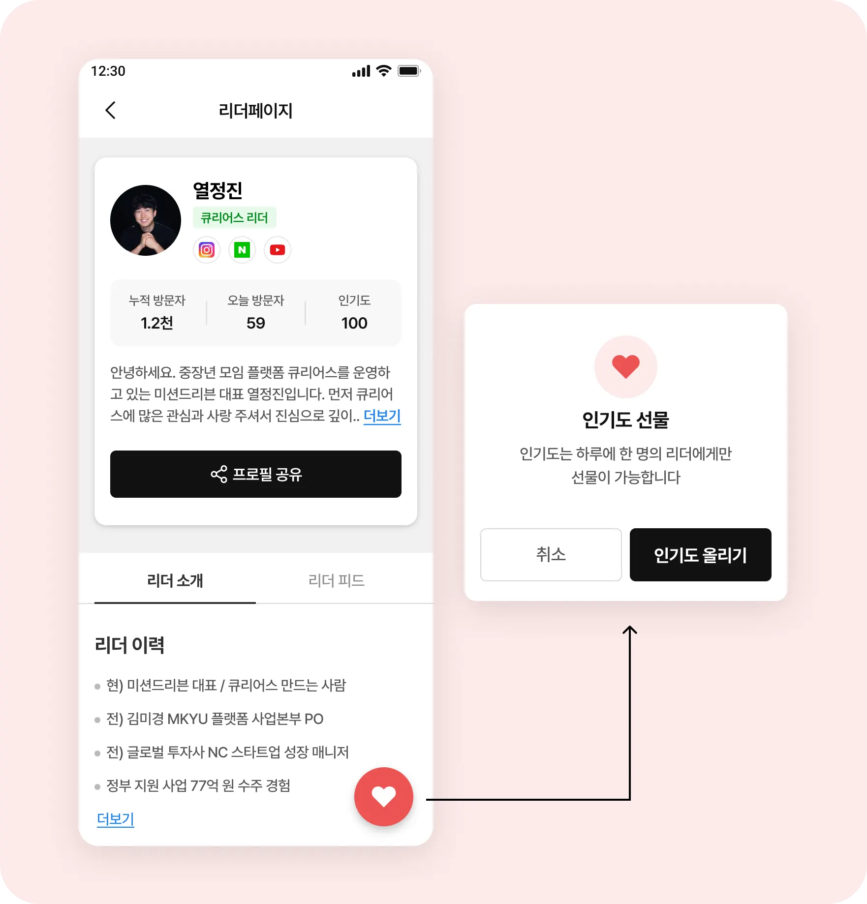 인기도는 하단에 있는 하트 버튼을 누르면 인기도를 선물할 수 있어요! 단, 인기도는 하루에 한 명의 리더에게만 선물이 가능하니 신중하게 선택해야 한답니다~