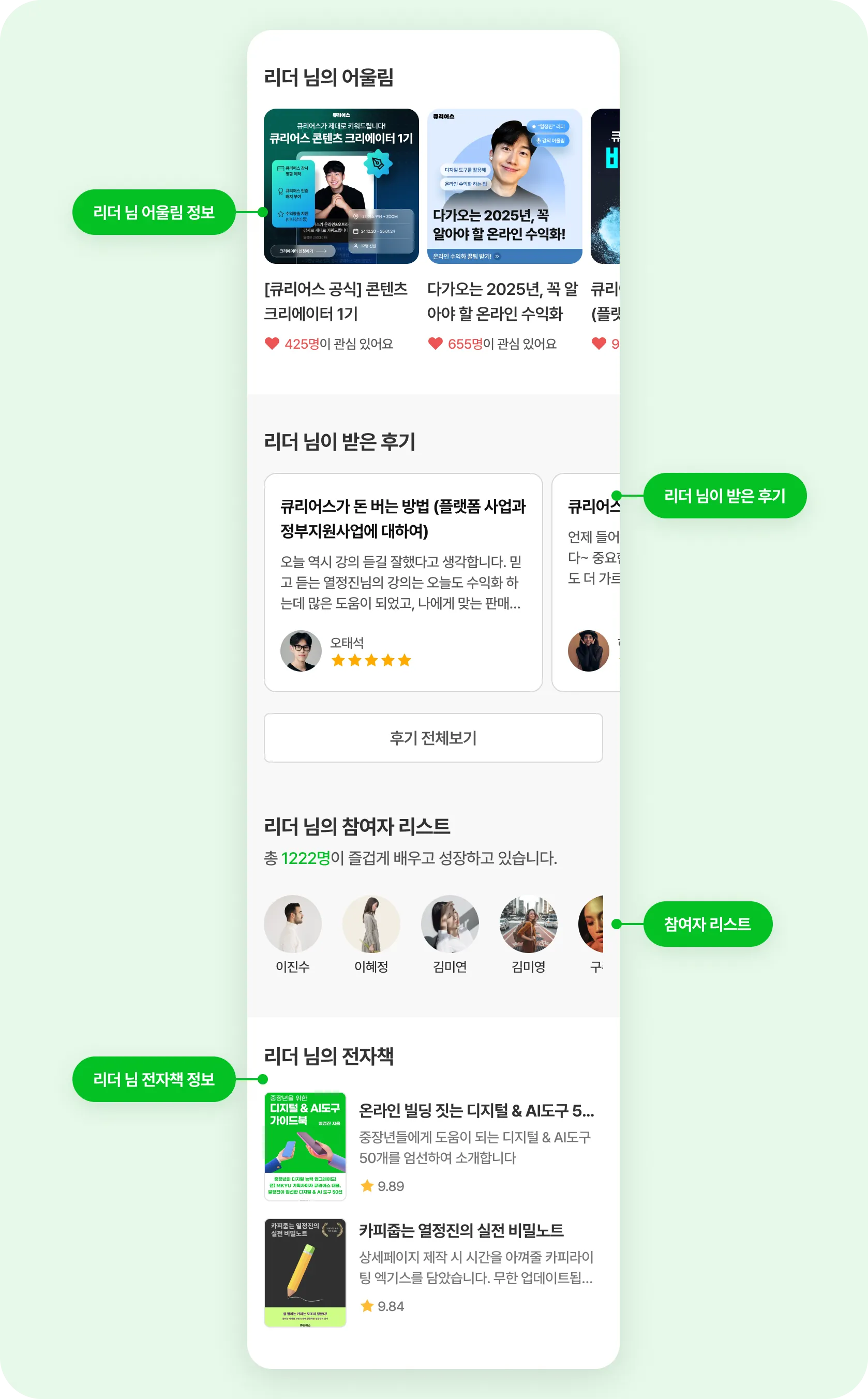 큐리어스가 리더님들을 더 매력적으로 보일 수 있도록 리더 페이지를 개선했습니다.