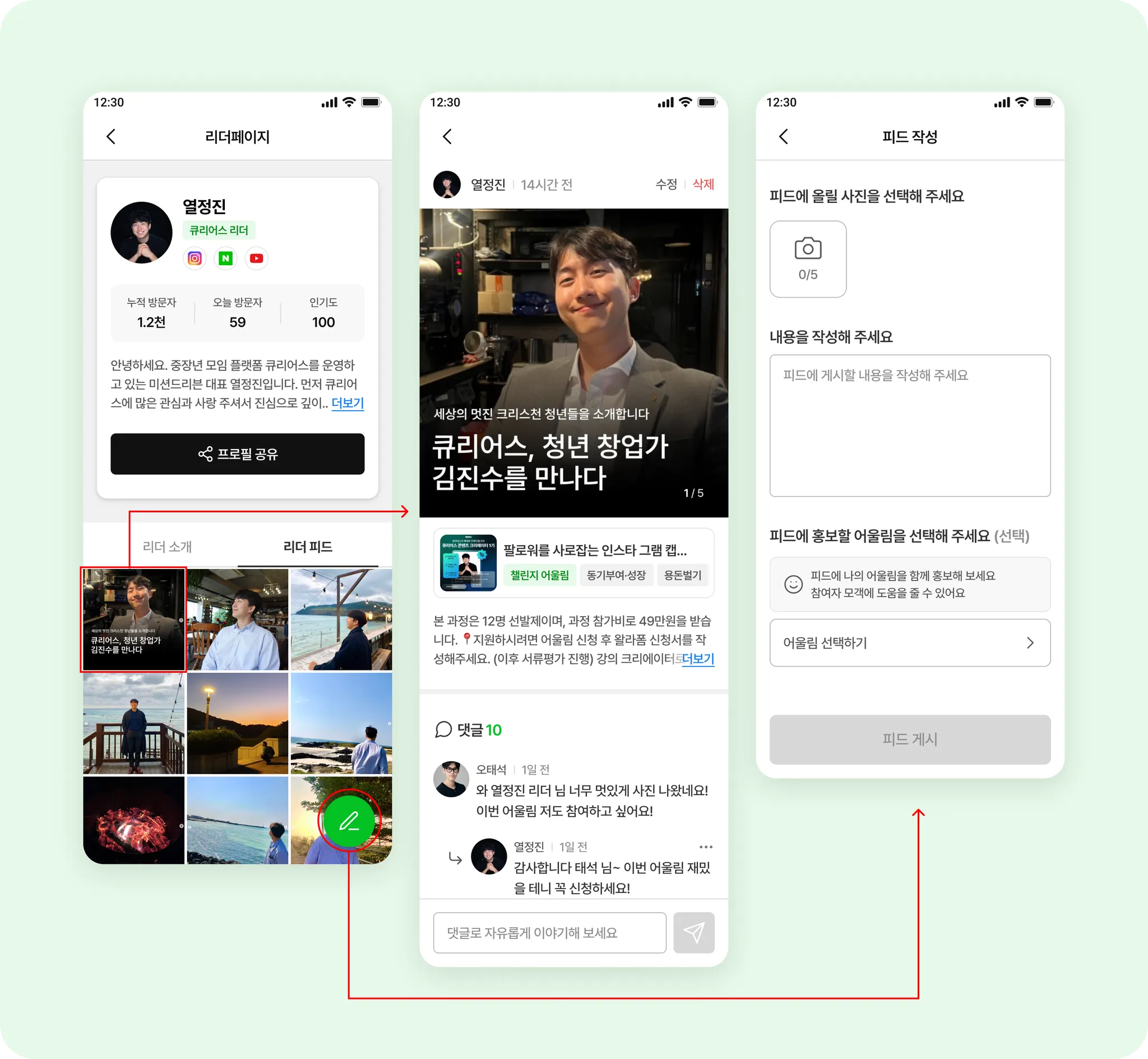 큐리어스 리더 페이지에서는 리더님의 정보뿐 아니라 리더님이 올리고 싶은 사진과 정보들을 통해 소통을 할 수 있습니다.