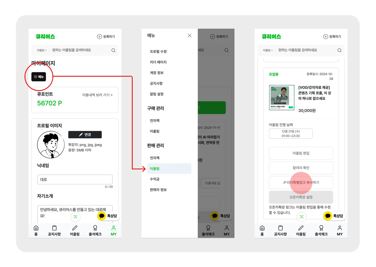 [마이페이지] → [판매관리] → [어울림] → 해당 어울림 아래 [리더특별링크 복사하기] 버튼